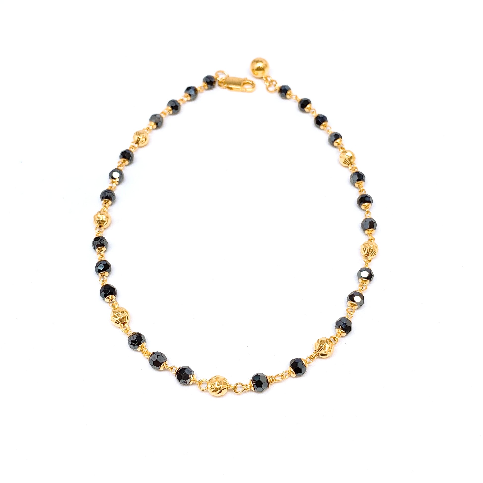 A charming anklet that showcases black faceted beads and 22k gold beads, bell and links, creating a stylish yet understated design while adding a pop of colour to your jewellery collection!