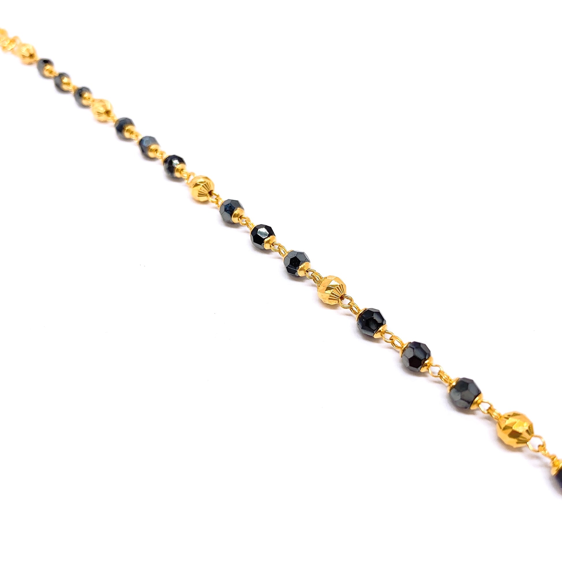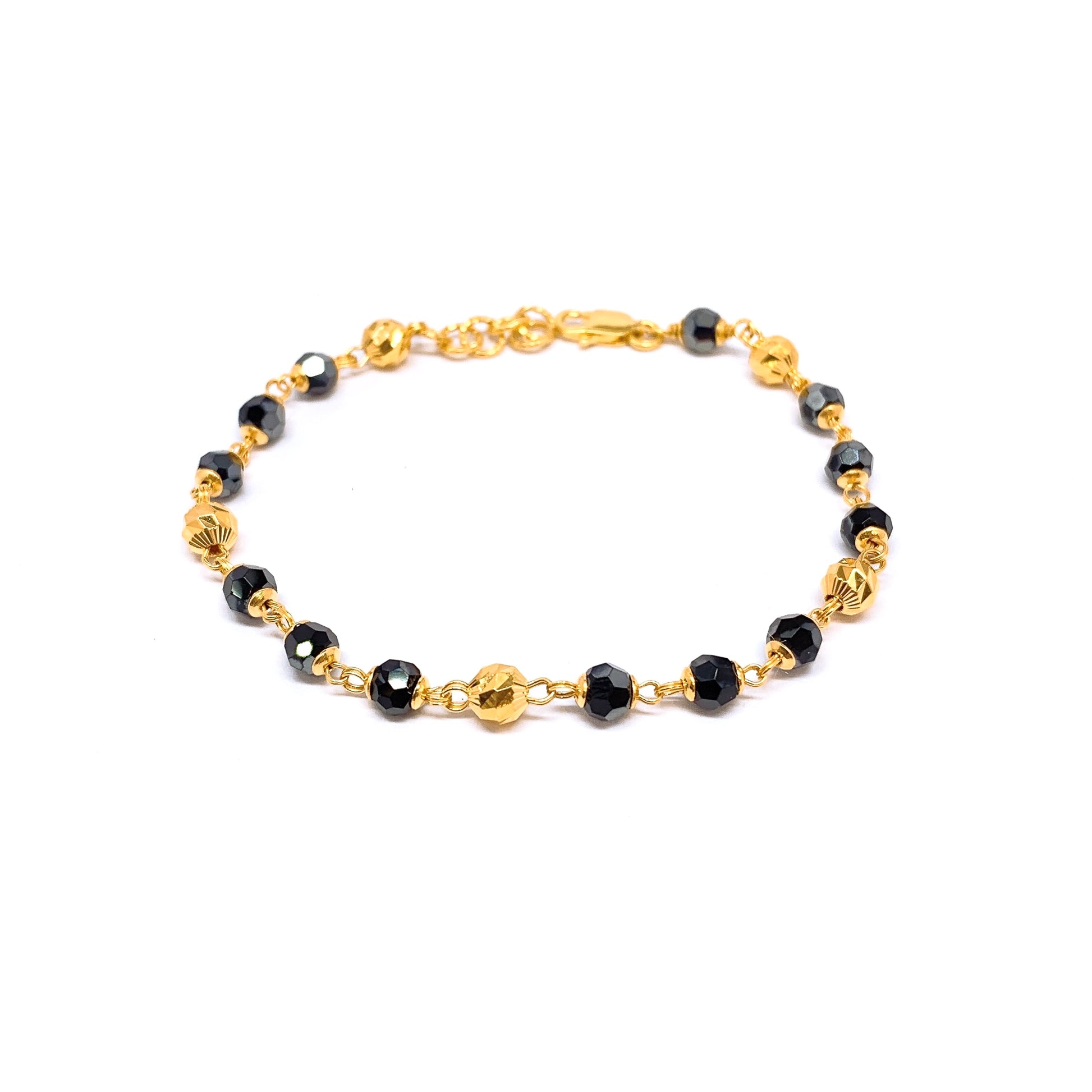 A charming bracelet that showcases black faceted beads and 22k gold beads and links, creating a stylish yet understated design while adding a pop of colour to your jewellery collection!