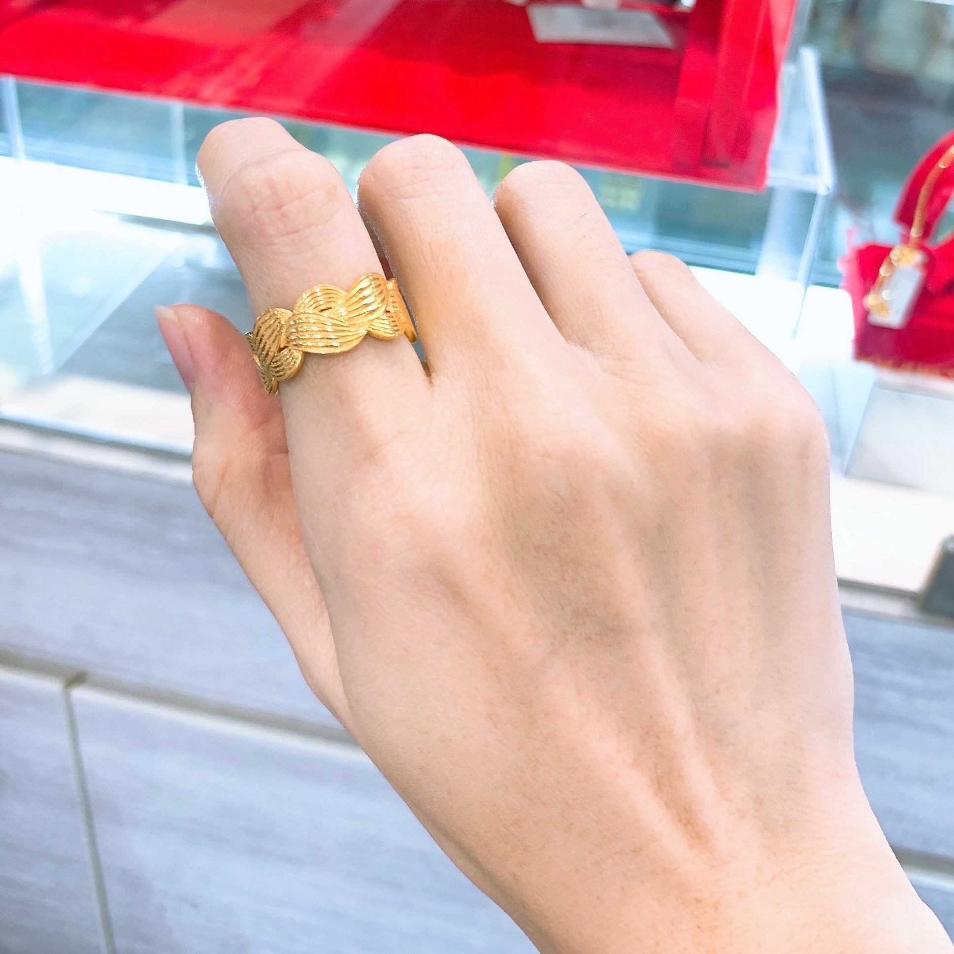 A lightweight broad 22k gold ring which features a braided full band in matte finish.