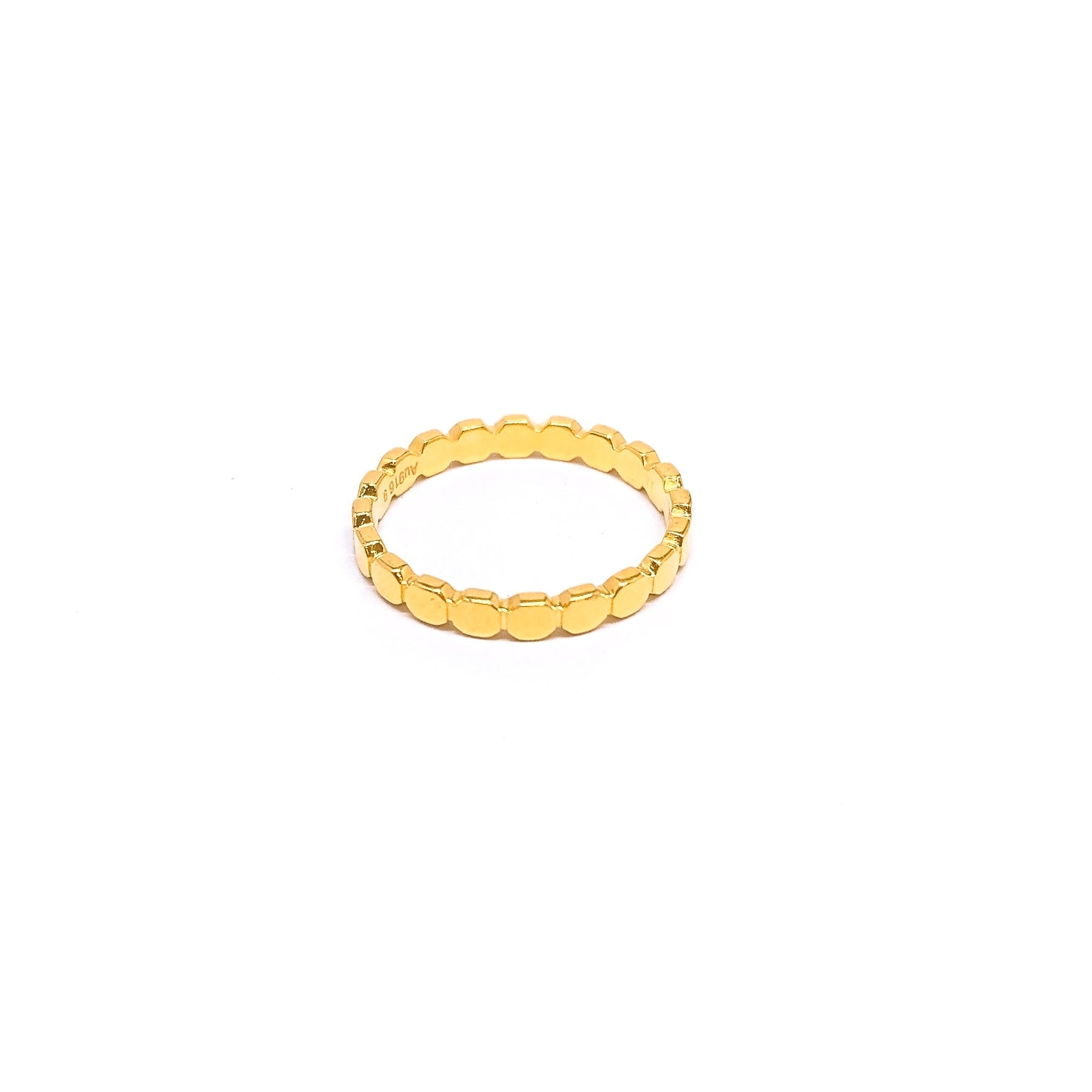 A simple and timeless design, this 22k gold polished ring features mini chipped blocks lined up side by side to form a full band. It is a dainty piece that is suitable for stacking or for wearing on your pinky finger!
