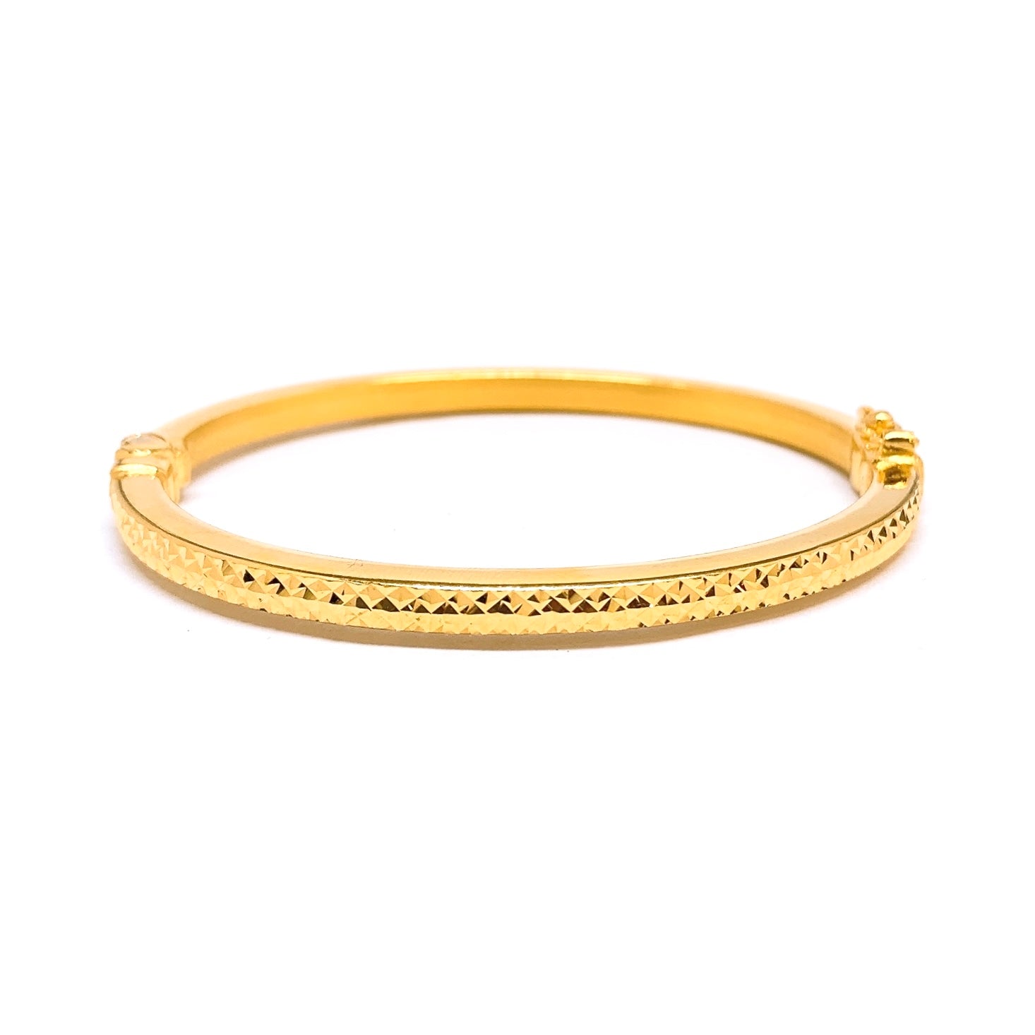 Crafted in 22k gold, this bangle features criss cross cutting, making it extra shimmery. Bling up with this oval shaped bangle that is timeless and elegant!