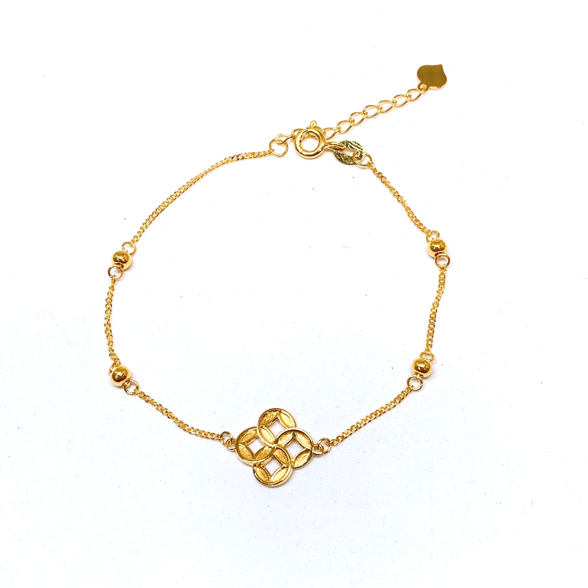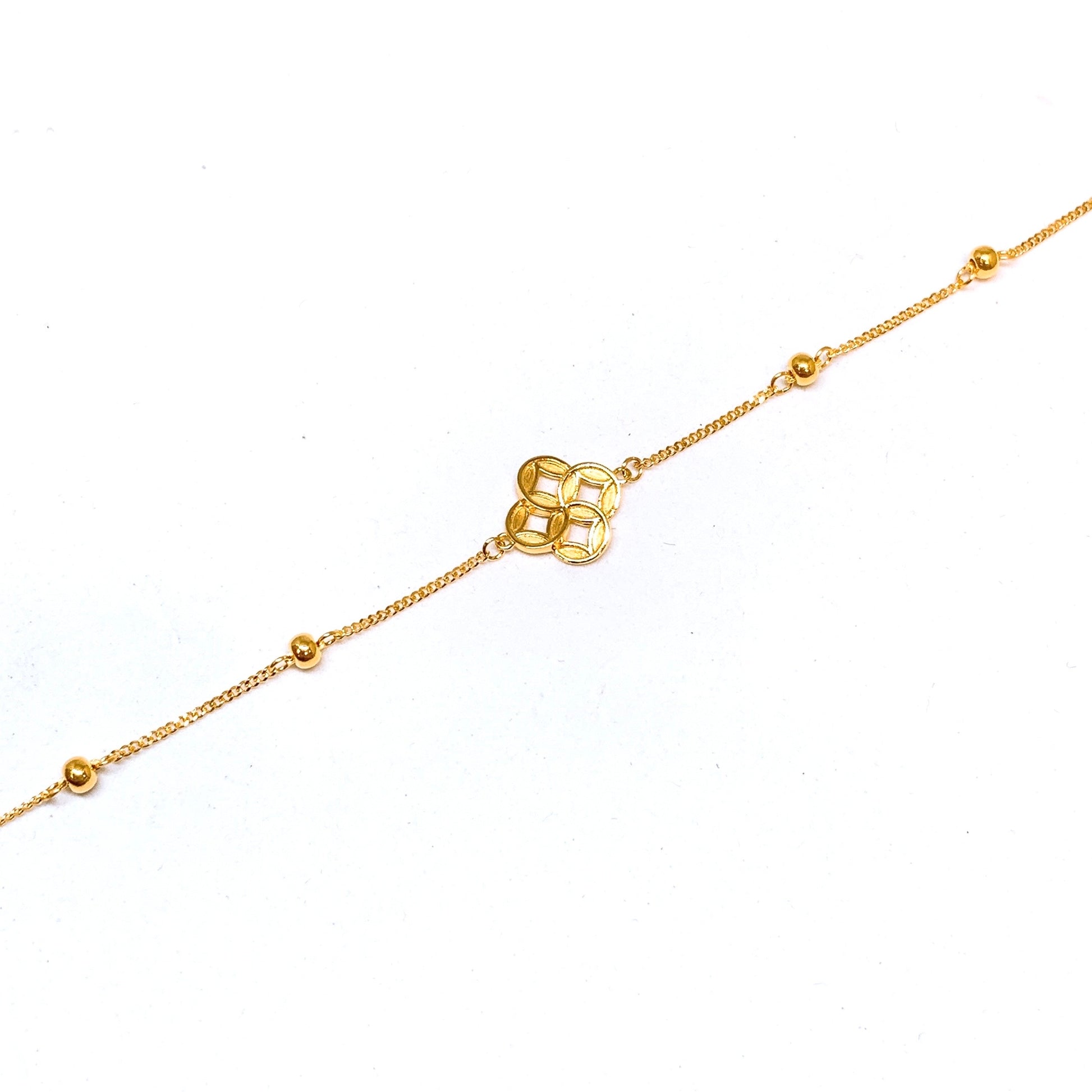 A dainty beaded curb chain bracelet featuring cut-out coins charm in the middle, secured with a Q spring clasp and adjustable hoops for easy length adjustment. An auspicious yet modern design for wealth and prosperity.