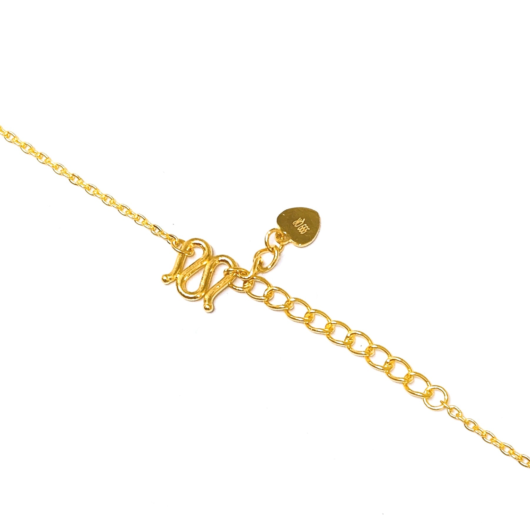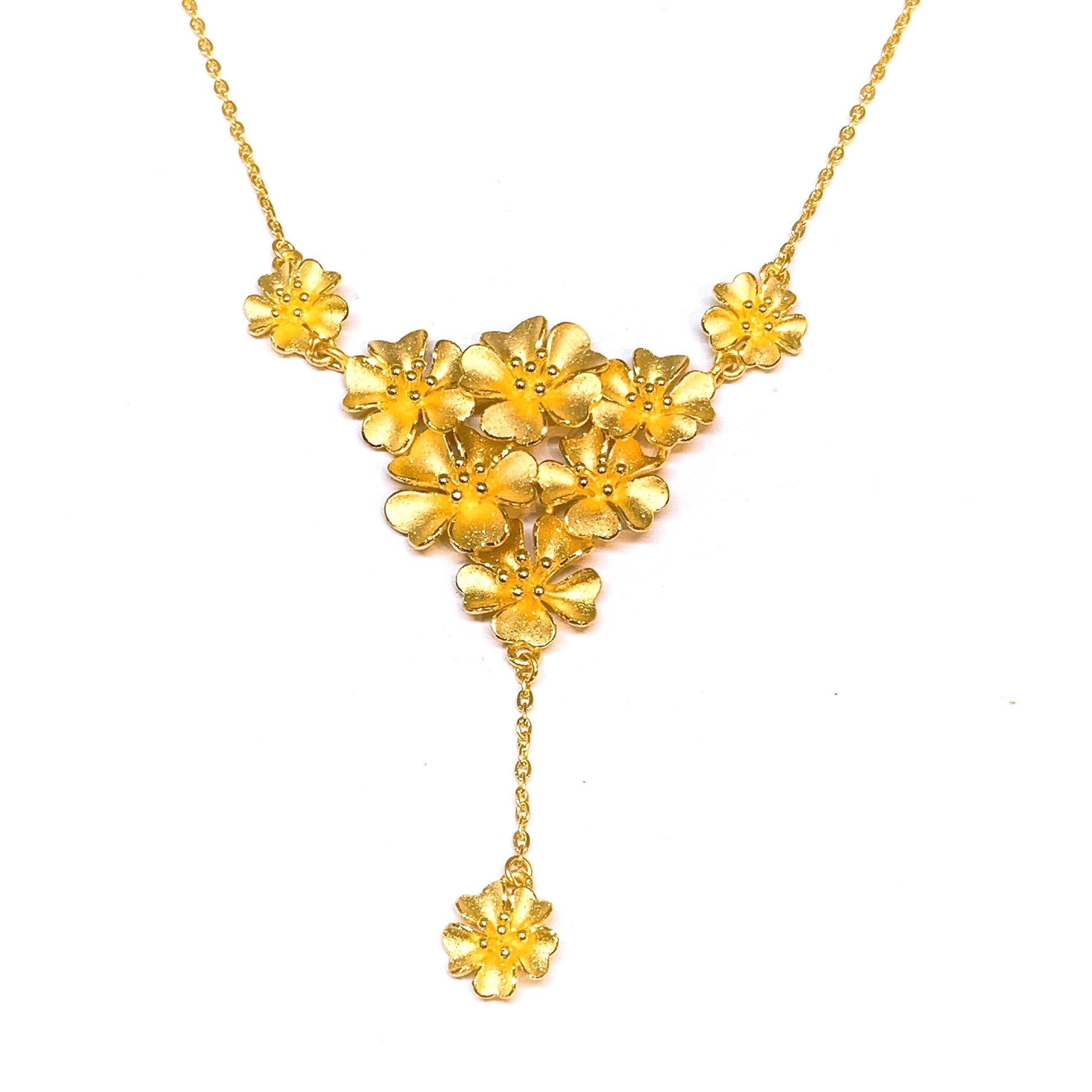 A dainty cable chain attached to a cluster of pure gold intricate flowers and featuring a single dangling flower. This eye-catching necklace set is perfect for any bride-to-be as part of their wedding 四点金.
