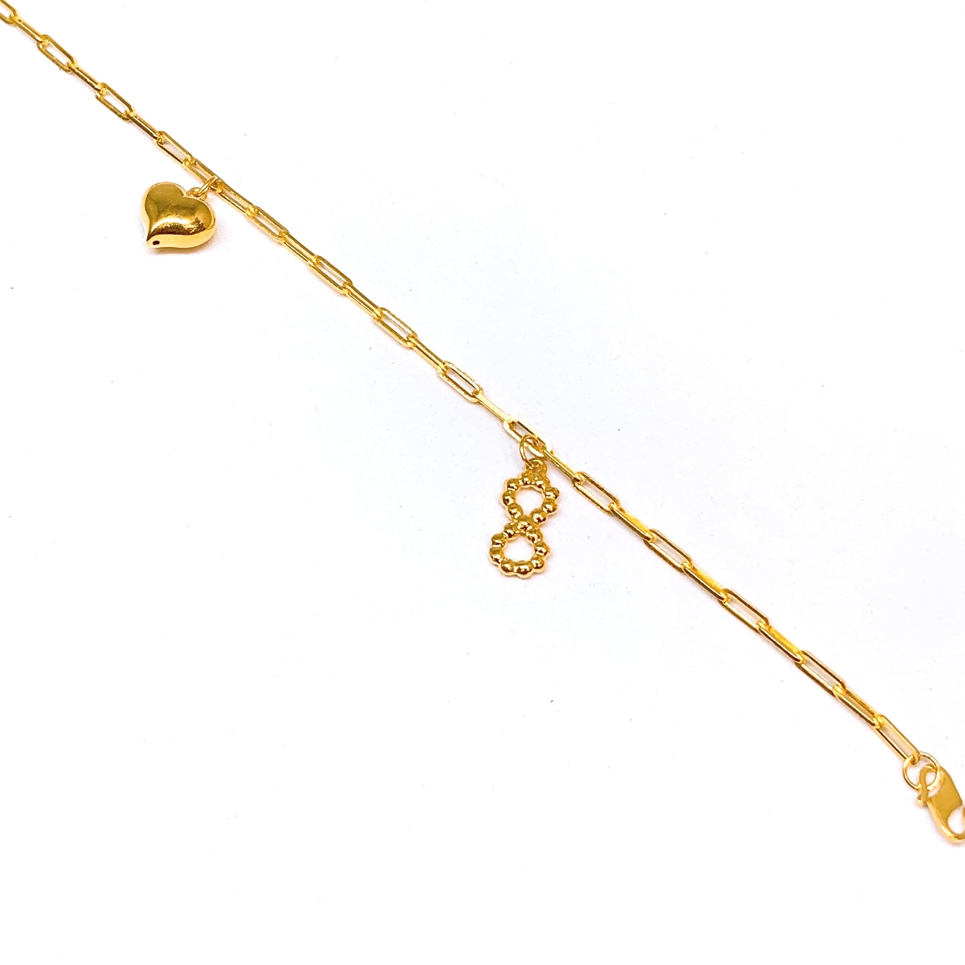 A dainty paperclip chain bracelet with a dangling puffy heart polished charm and a beaded infinity charm and adjustable hoops for easy length adjustment.