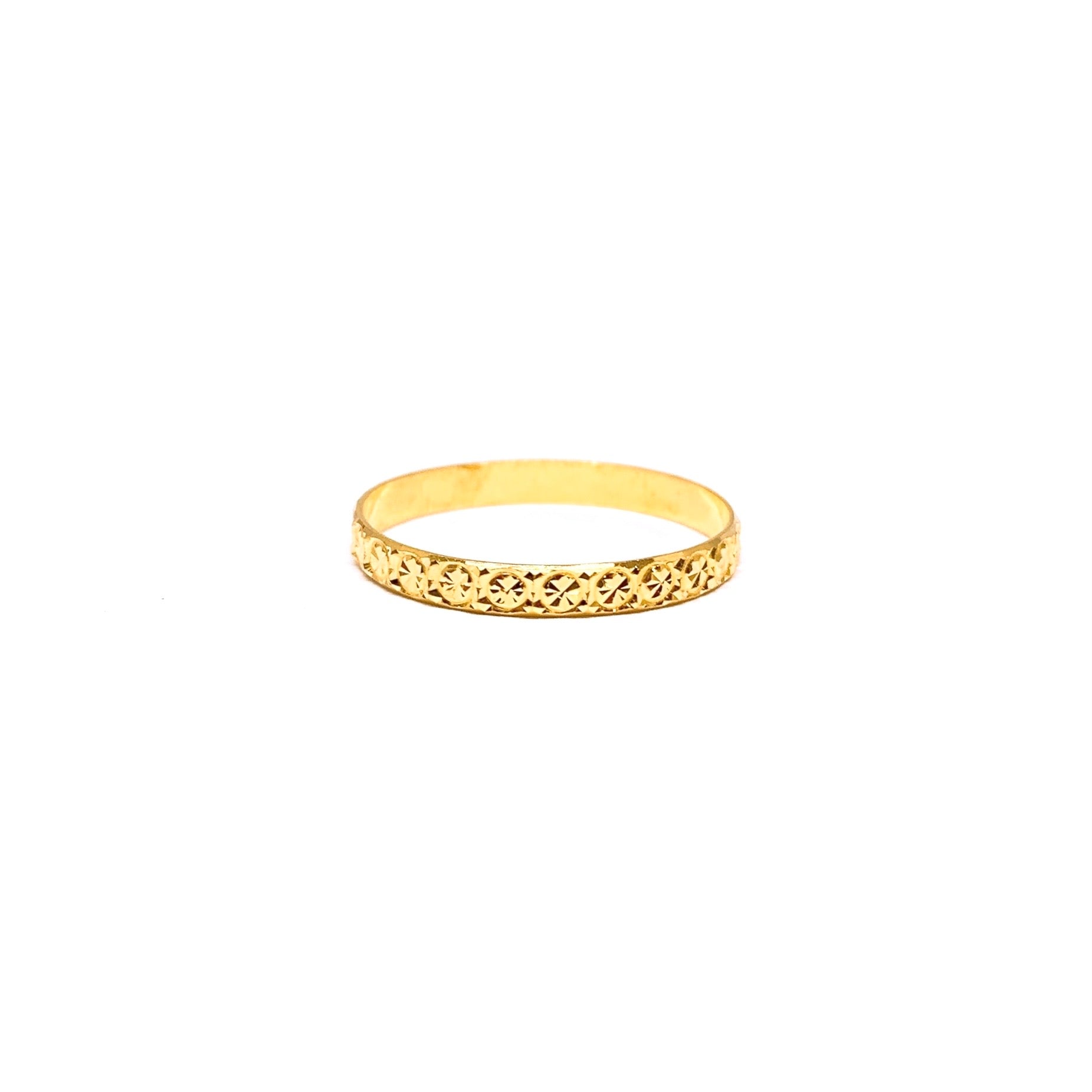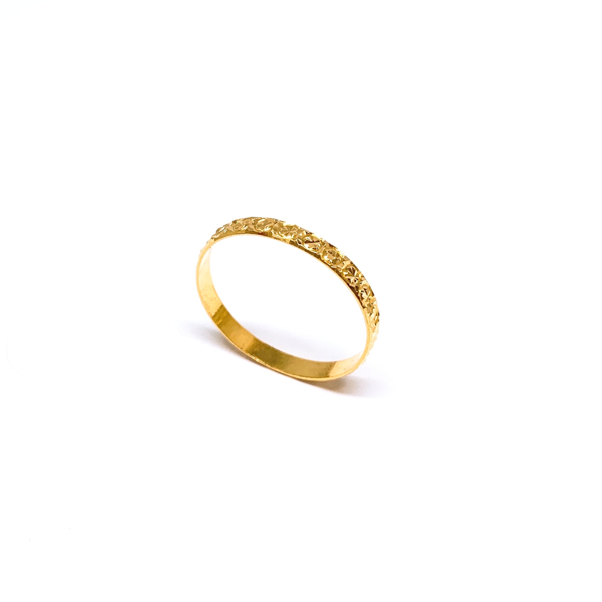 This 22k gold fine ring features starburst cutting that makes it look especially shimmery. It is perfect for wearing on it's own for a dainty look or as a stacking piece. This is one of our best sellers for pinky ring design and is also available in two tone version.