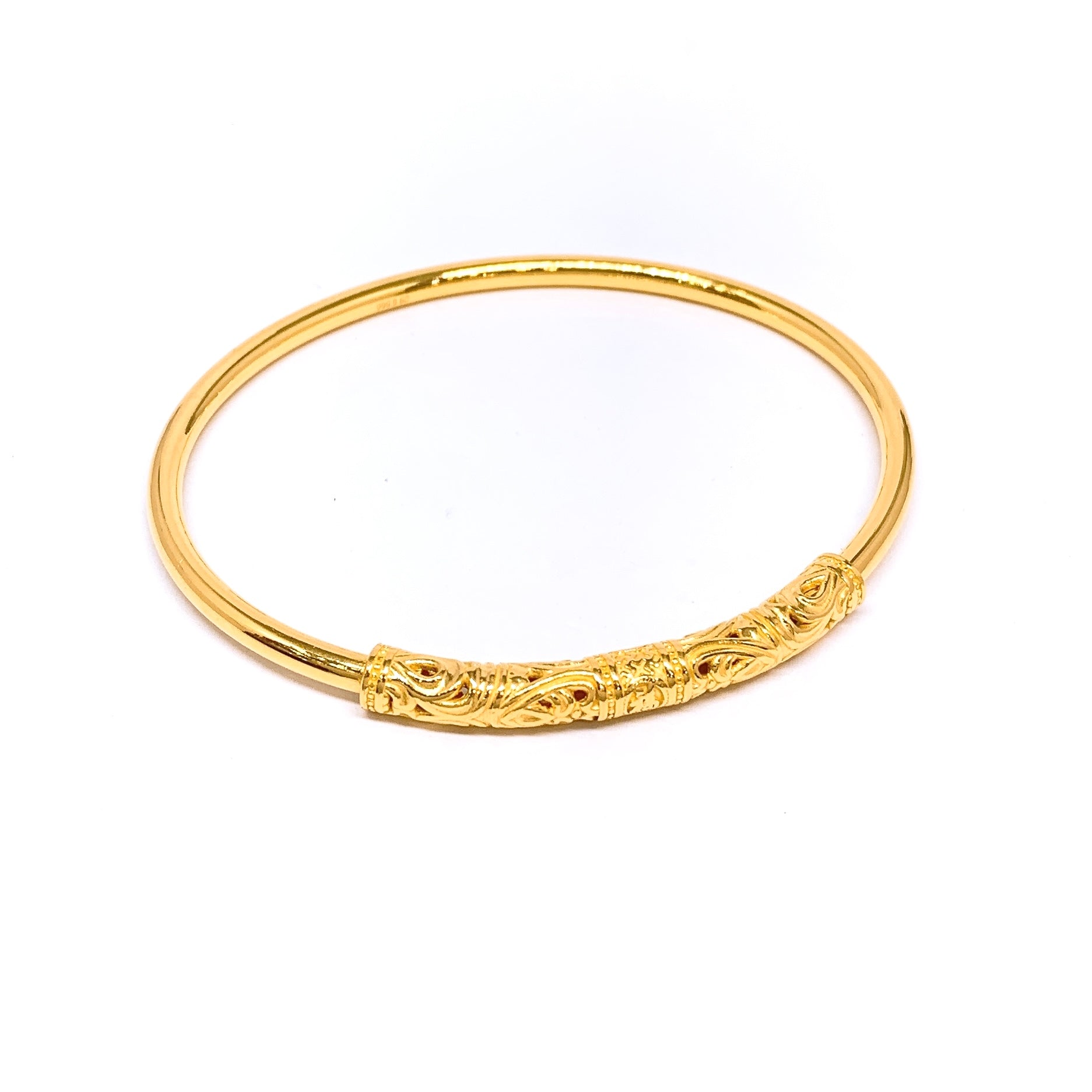 An exquisite oval shaped bangle inspired by the Monkey King's ( Sun Wu Kong ) golden rod and made in pure gold. It is designed with a seamless opening; simply pull one end of the rod and twist it to open the bangle. This unisex and timeless bangle is great for daily wear and a perfect piece of jewellery for the Wukong fanatics.