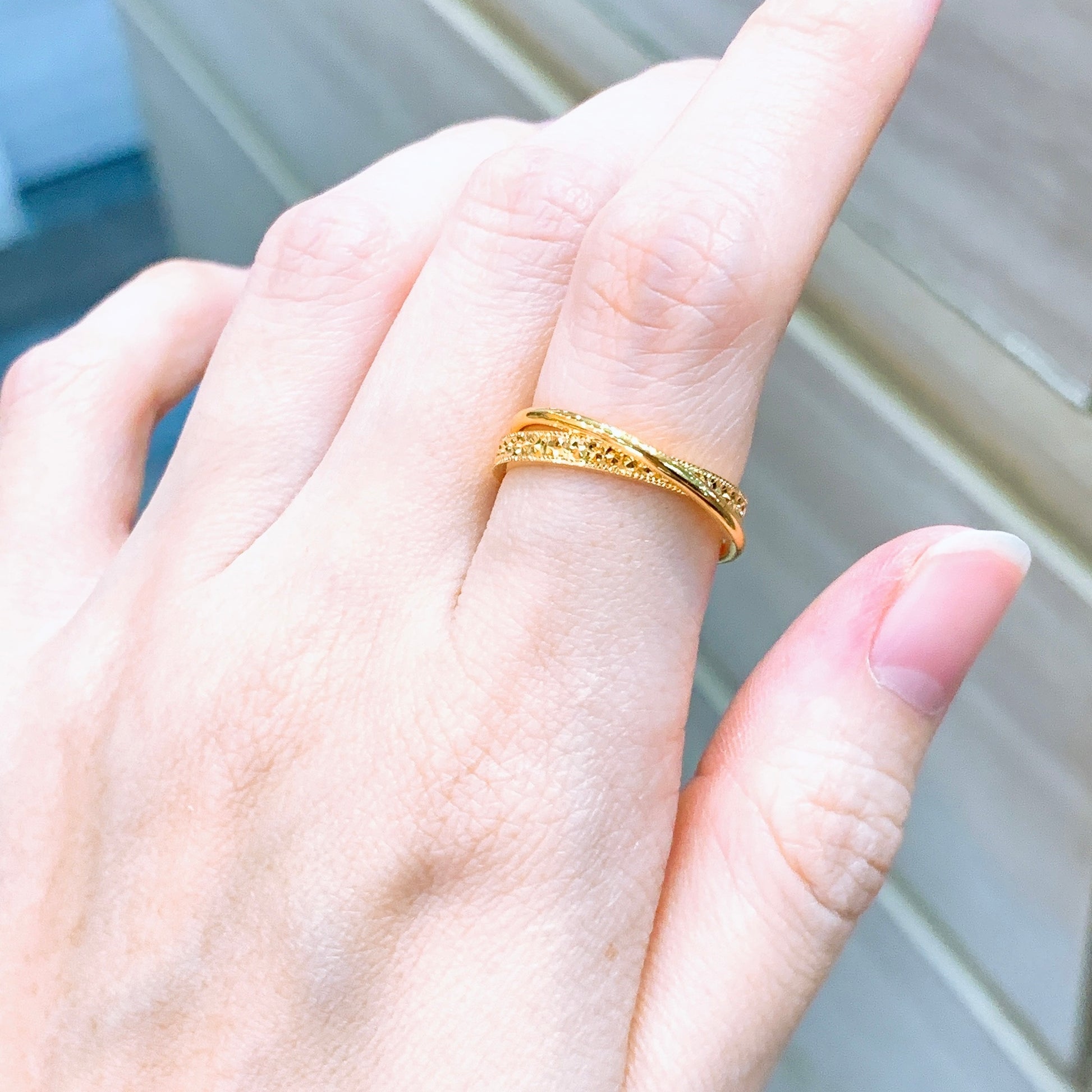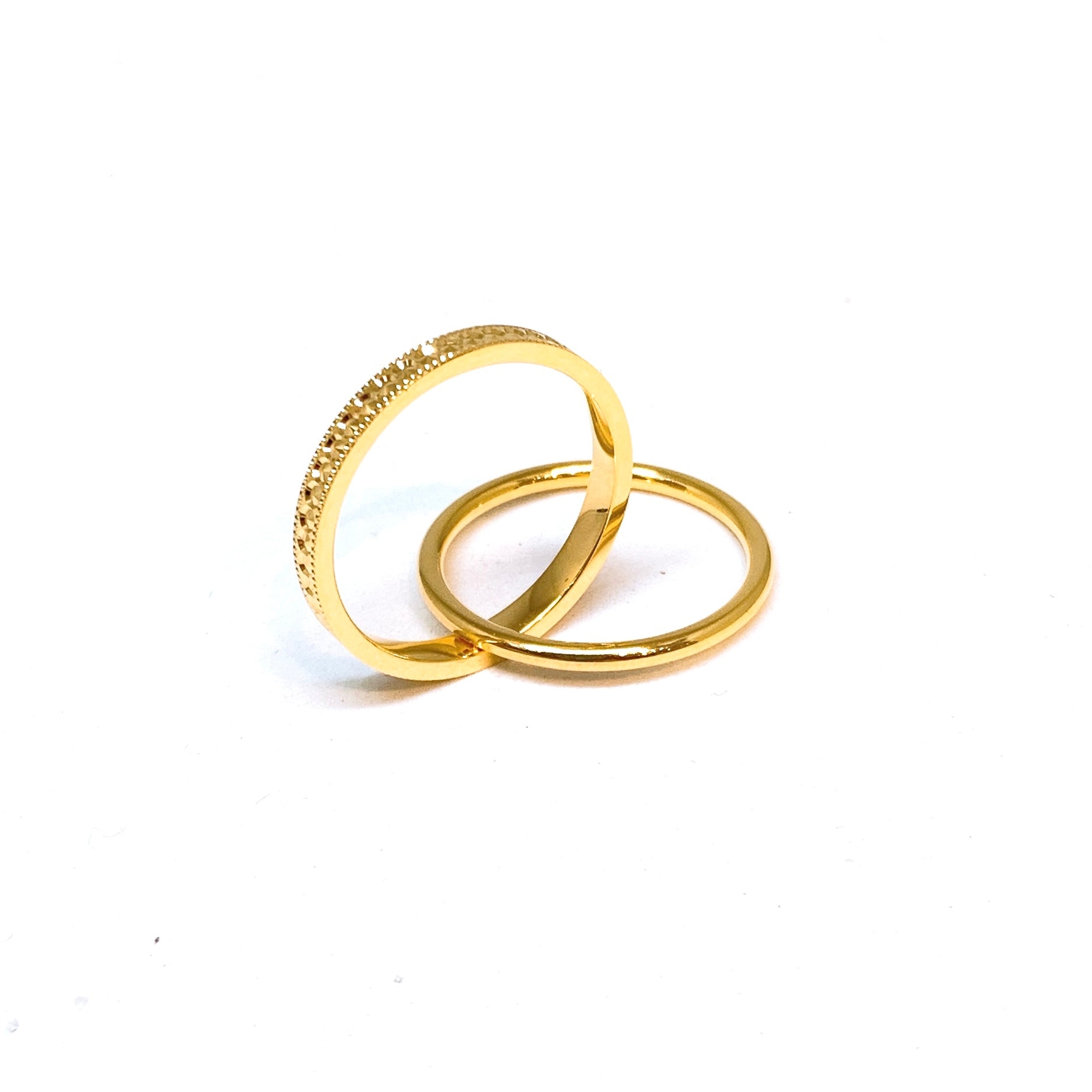 A modern set of rings that is interlinked for a unique style. This one features a dainty rounded polished ring linked with a comfort fit thin band with cutting and has a criss-cross effect when worn.
