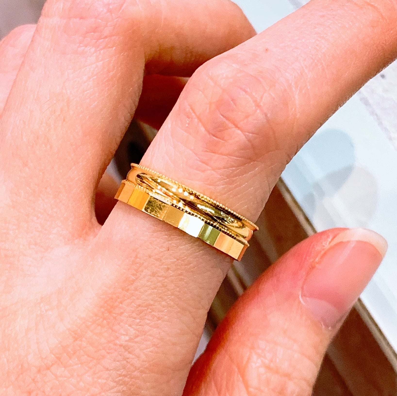 A unisex and modern ring featuring a row of polished blocks and a row of millgrain edged band, stacked together to form a unique ring that looks like a stacked band when worn. This ring also features slightly curved inner band known as a comfort fit for a more comfortable fit, perfect as a wedding band.