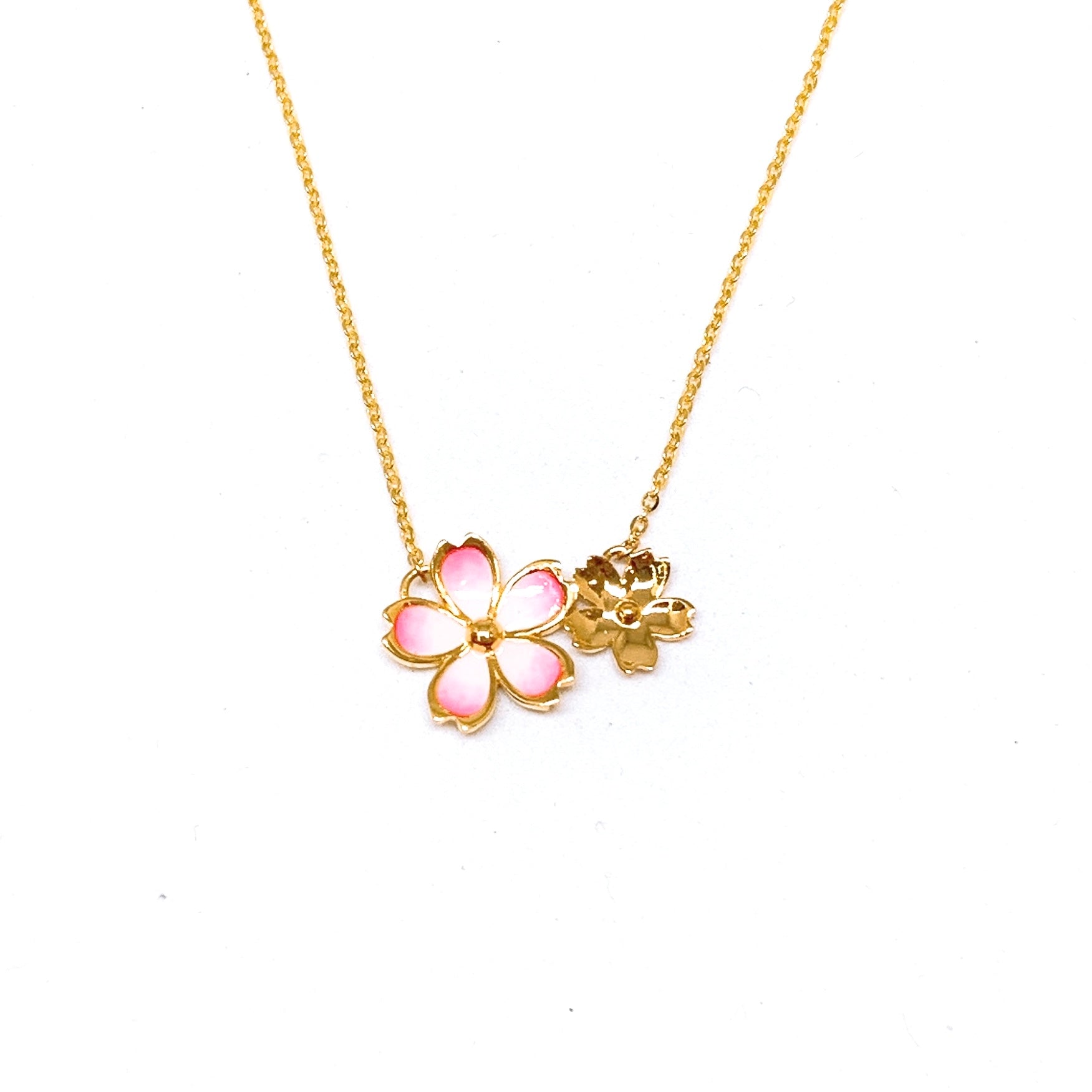 A sweet pink ombre flower with a full gold flower necklace set featuring a dainty polo chain with adjustable hoops for easy length adjustments.