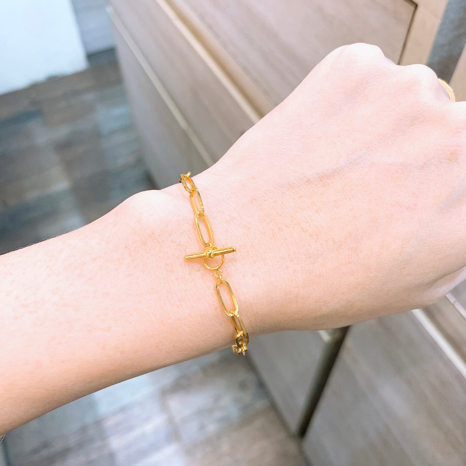 A simple and timeless high polished paperclip link bracelet that features a petite toggle clasp. This versatile piece is perfect for daily wear and can also be added to an existing bracelet stack for an elevated style.