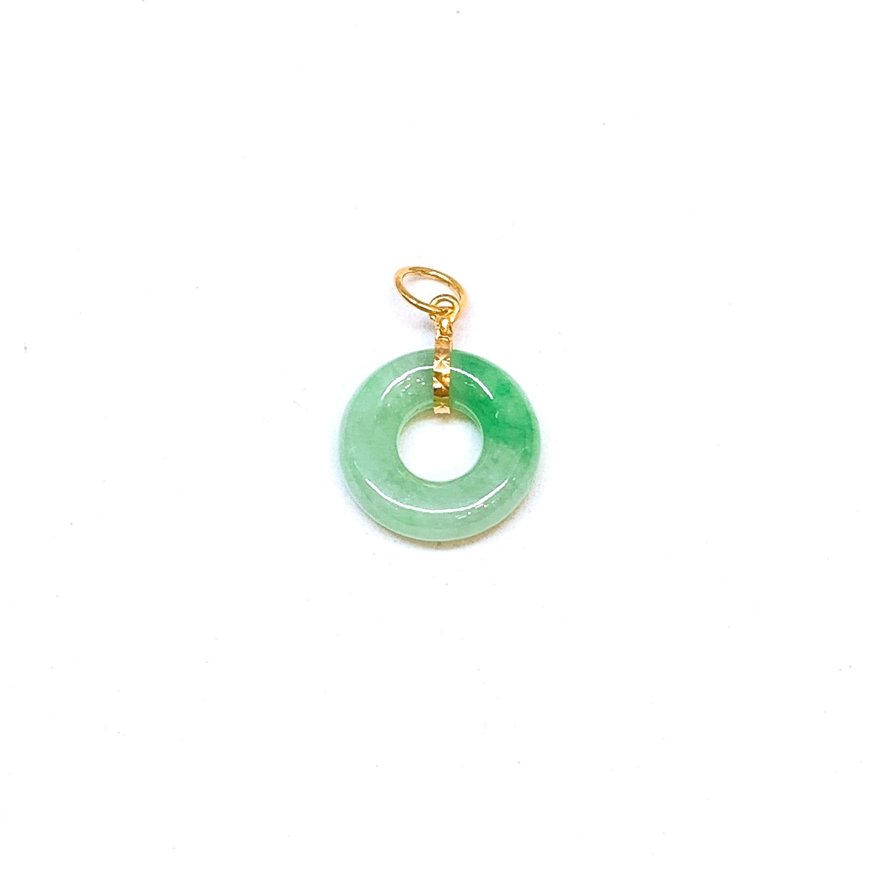 A simple donut shaped Myanmar jade pendant in a lovely shade of green with a 22k gold bail. In Fengshui terms, green jade is connected to the wood element and is associated with good health, protection, and longevity.