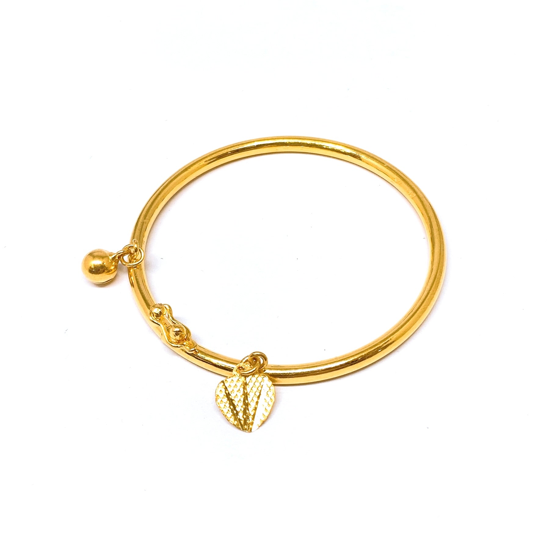 Crafted in 22k gold, this baby bangle features a polished round tubing all the way round. It also comes with a dangling heart and a dangling bell. This twist-type bangle is secured with a figure 8 security clasp, making it secure and safe for babies.