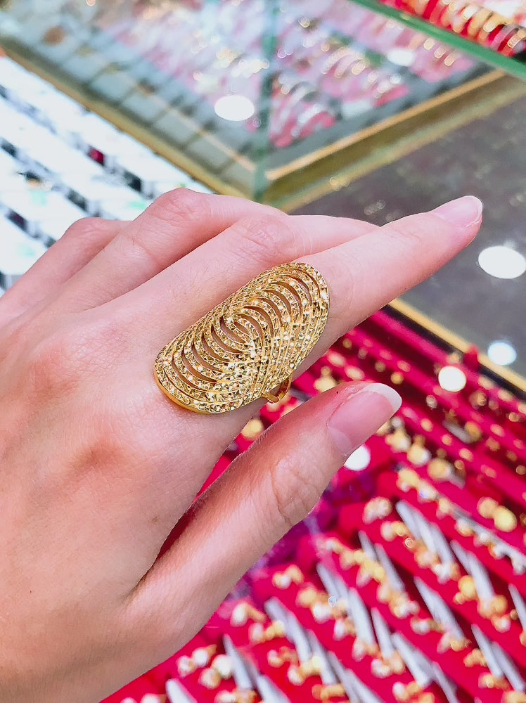 22k gold eye-catching ring with a design that is shaped like a pringle chip, except this one is much shinier due to the cutting on it's surface. This statement piece is bound to elevate your look.