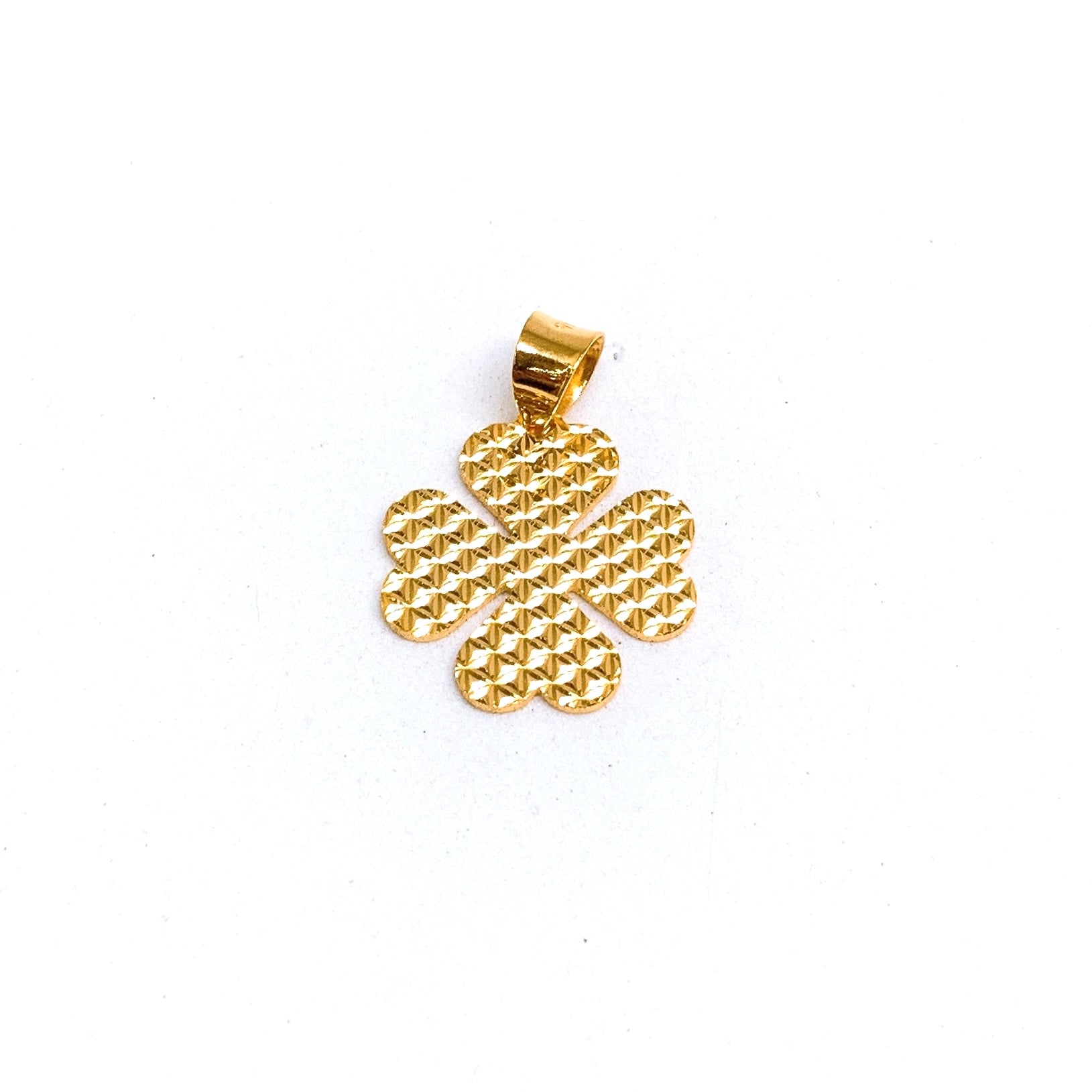 A shimmery 916 gold pendant featuring 4 hearts with sequin-like finish, forming a clover shaped design. A unique and lightweight pendant that is modern and stylish.