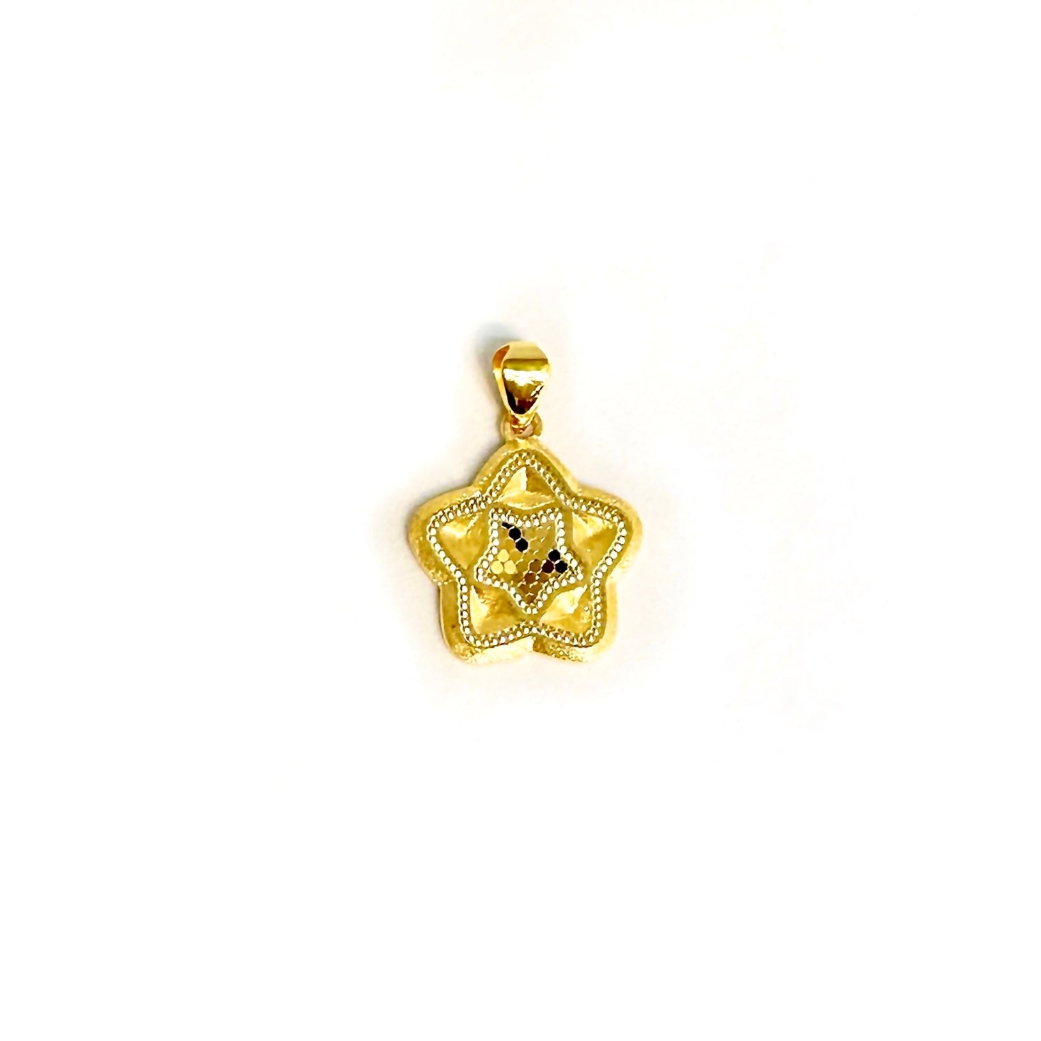 A lovely little star shaped pendant featuring dotted edging and a sequin-like center.