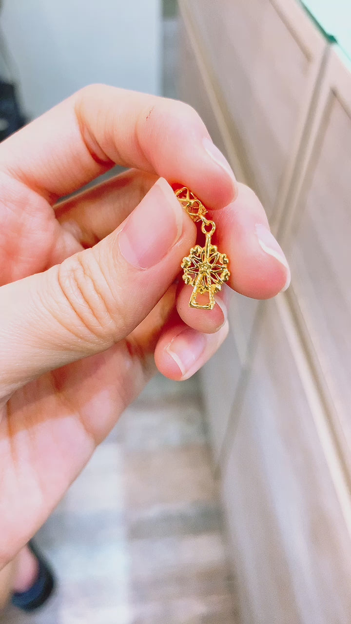 A unique 22k gold ferris wheel dangling charm that features a spinning wheel with small heart motifs. This dainty charm can also be worn as a pendant for your necklaces!