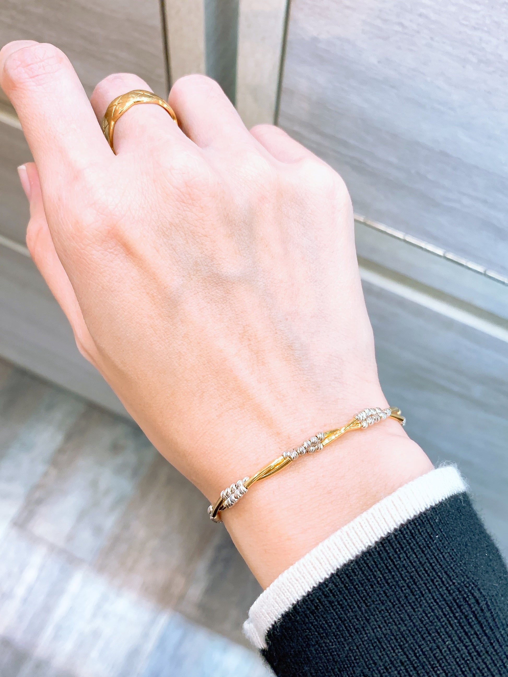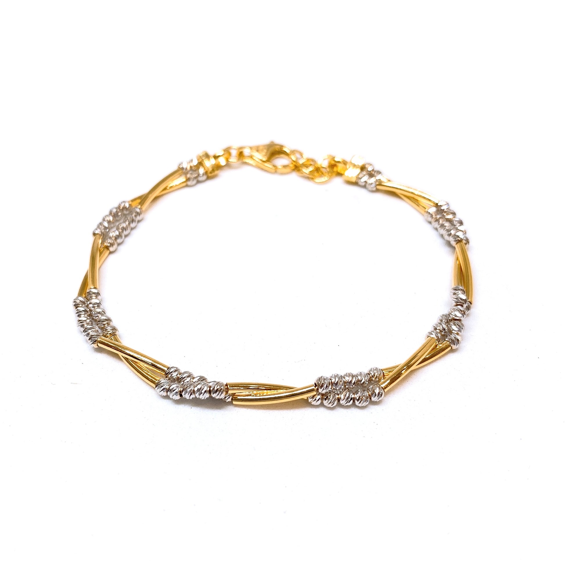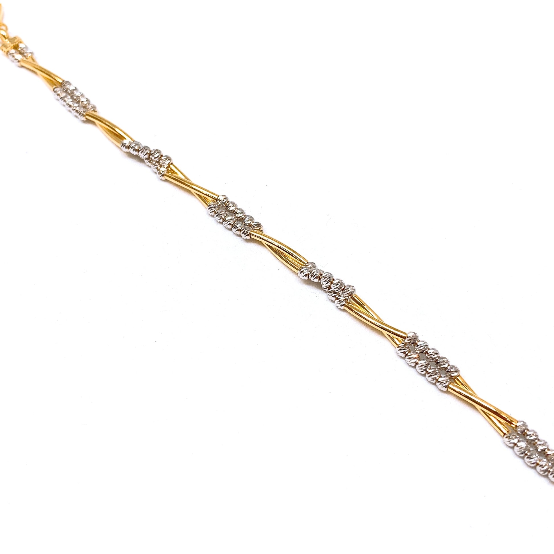 A two tone shimmery bracelet made of 22k gold featuring beads with cutting and polished curved rods twisted together to form an elegant and timeless bracelet suitable for all occasions.