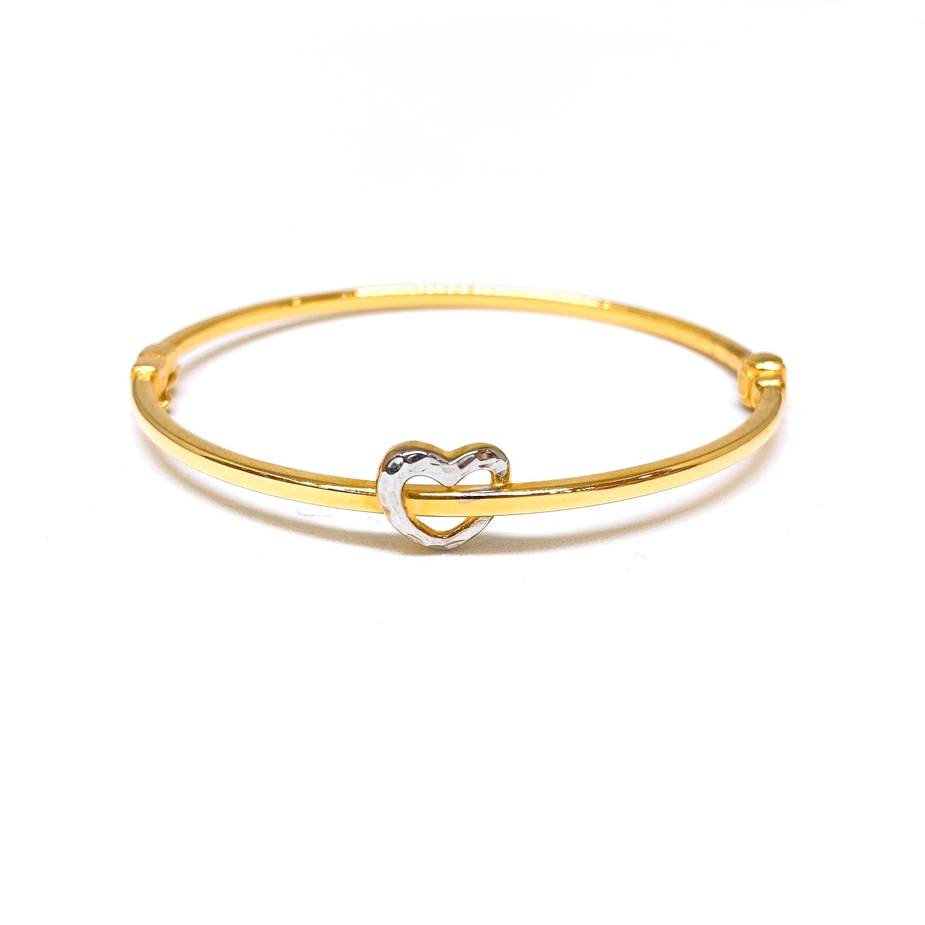 A dainty bangle featuring a white gold plated cut-out heart with hammered finish on a polished fine oval bangle that comes with a spring mechanism and figure 8 clasp opening mechanism. This sweet bangle is suitable for daily wear and is easy to style as it goes beautifully with both yellow gold and white gold jewellery!