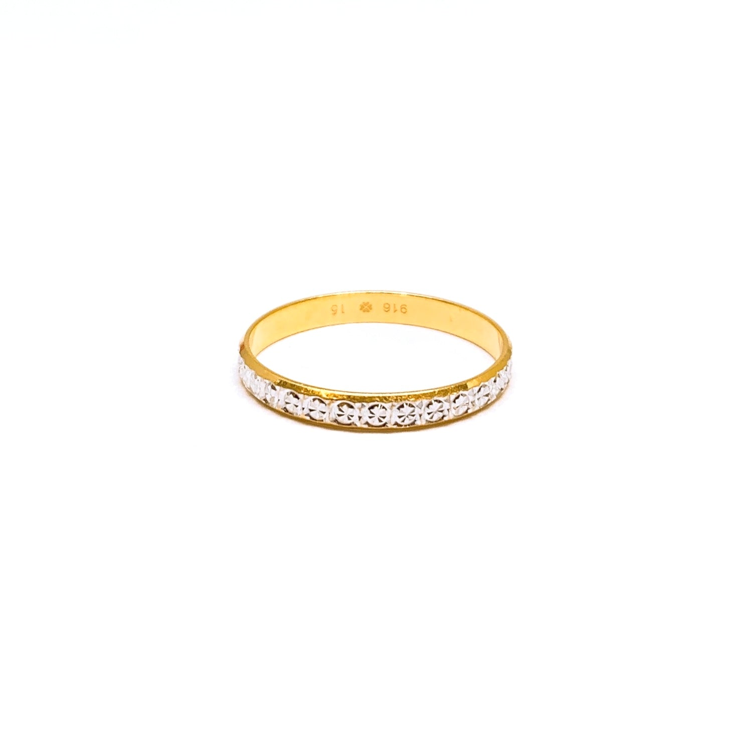 This 22k gold two tone fine ring features starburst cutting that makes it look especially shimmery and resembles diamonds from afar. It is perfect for wearing on it's own for a dainty look or as a stacking piece.