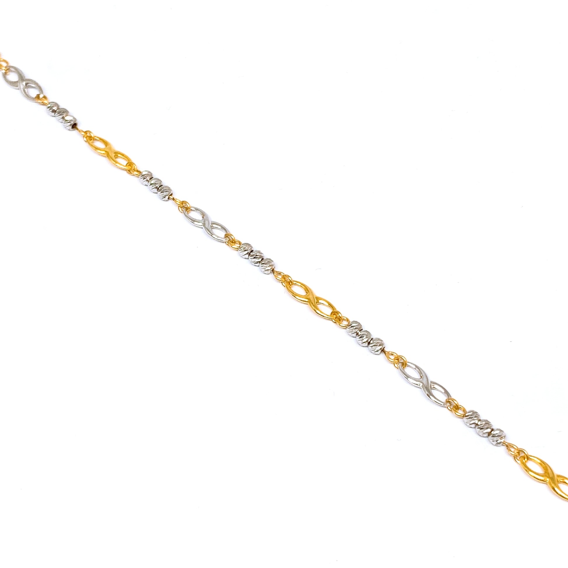 A dainty two tone bracelet with infinity links and beads with cutting. This bracelet comes with adjustable hoops on it's end for convenient length adjustments.