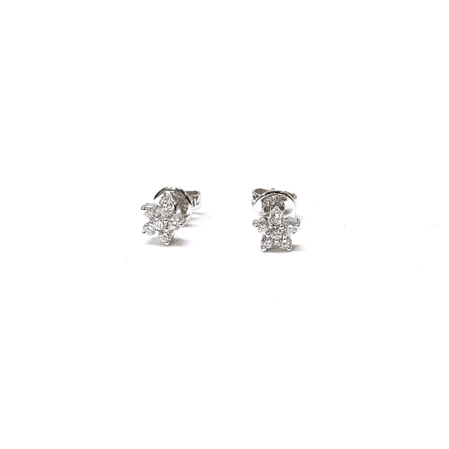 A pair of flower shaped earring studs made of 18k white gold featuring 6 sparkly natural diamonds on each side.