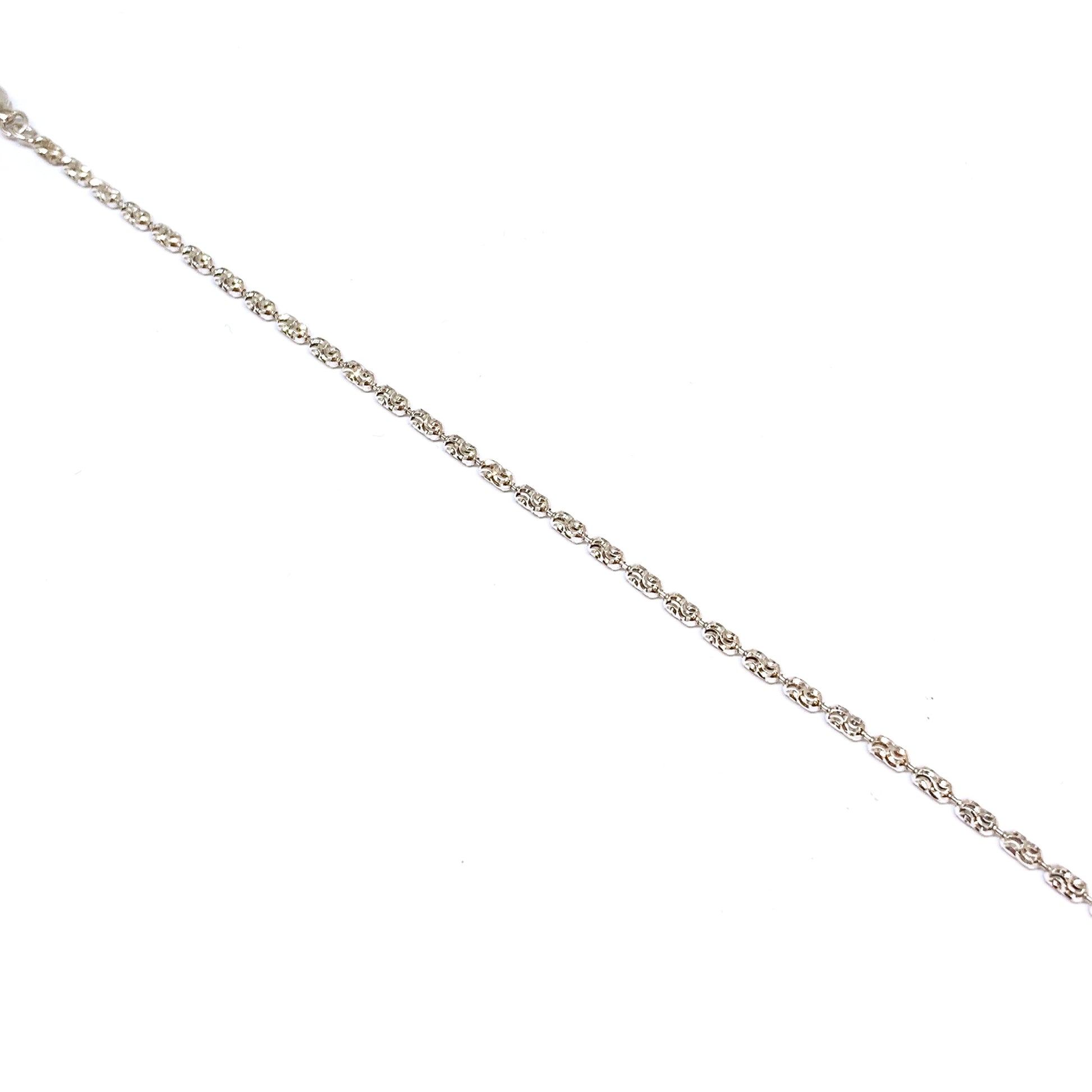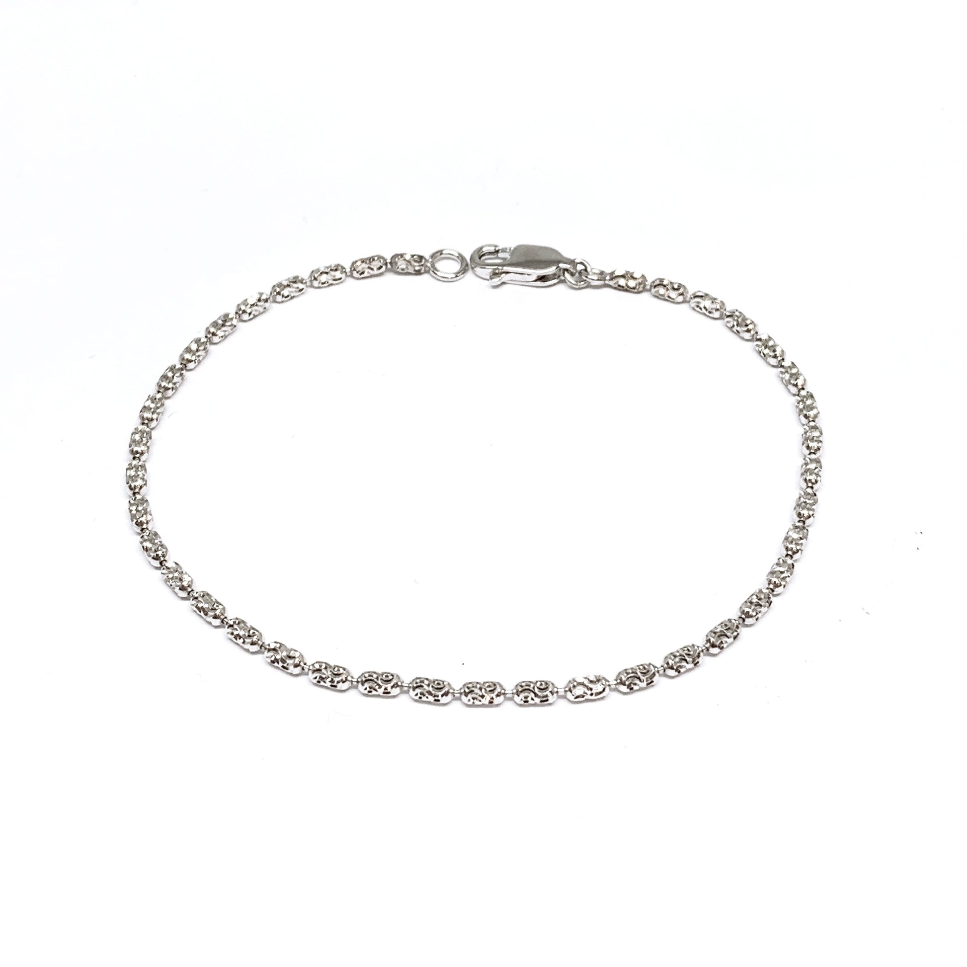 A fine white gold shimmery bracelet featuring oval shaped beads with cutting. This dainty bracelet will be a perfect addition to your jewellery collection if you are looking to up your stacking game!